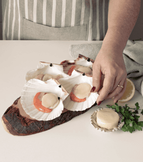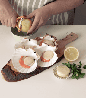 Togli la padella dal fuoco e disponi le capesante su un letto di purè insieme alle scorze di limone. Guarnisci a piacere con della misticanza.