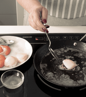 In una padella antiaderente scalda un cucchiaio d’olio con un poco di burro, aggiungi i molluschi e saltali per 1 minuto, poi bagnali con il succo del limone e fai cuocere per 5 minuti.