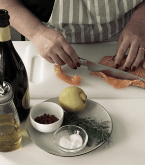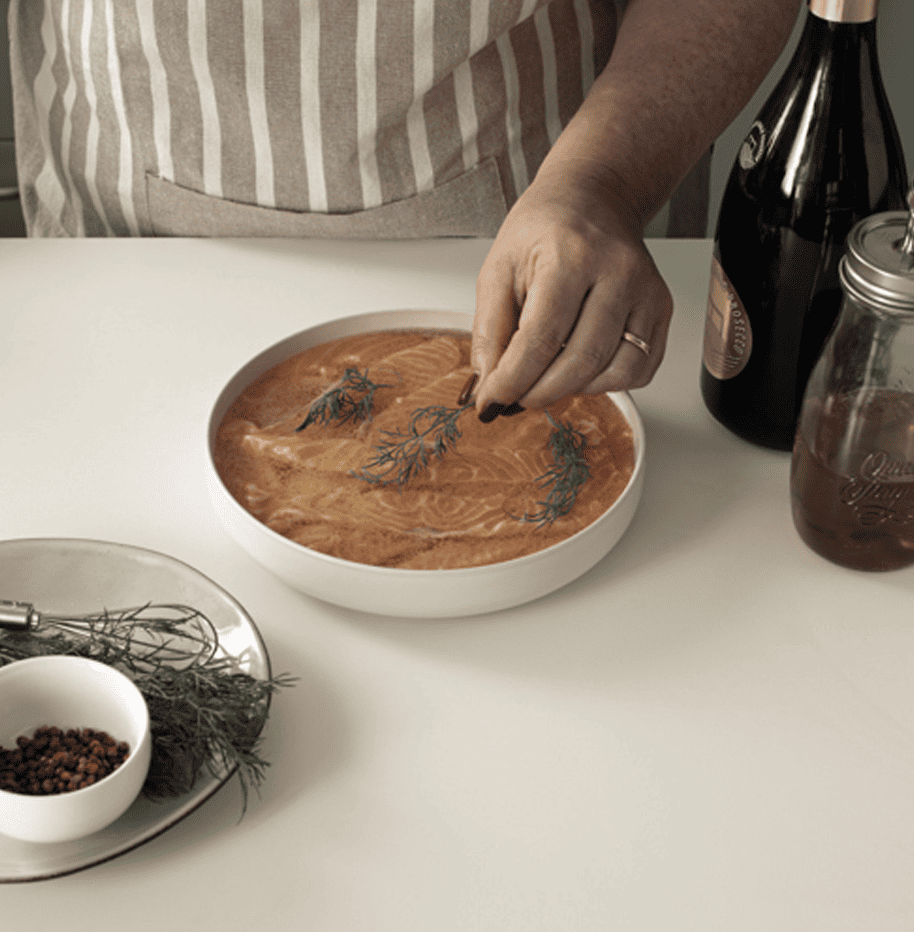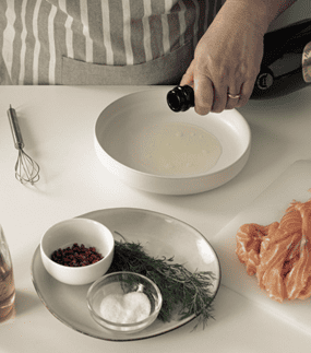 Taglia il salmone a fettine sottili e disponili in una pirofila. Condisci il salmone con l’emulsione e lascia riposare in frigo per un’ora circa coperto da pellicola.